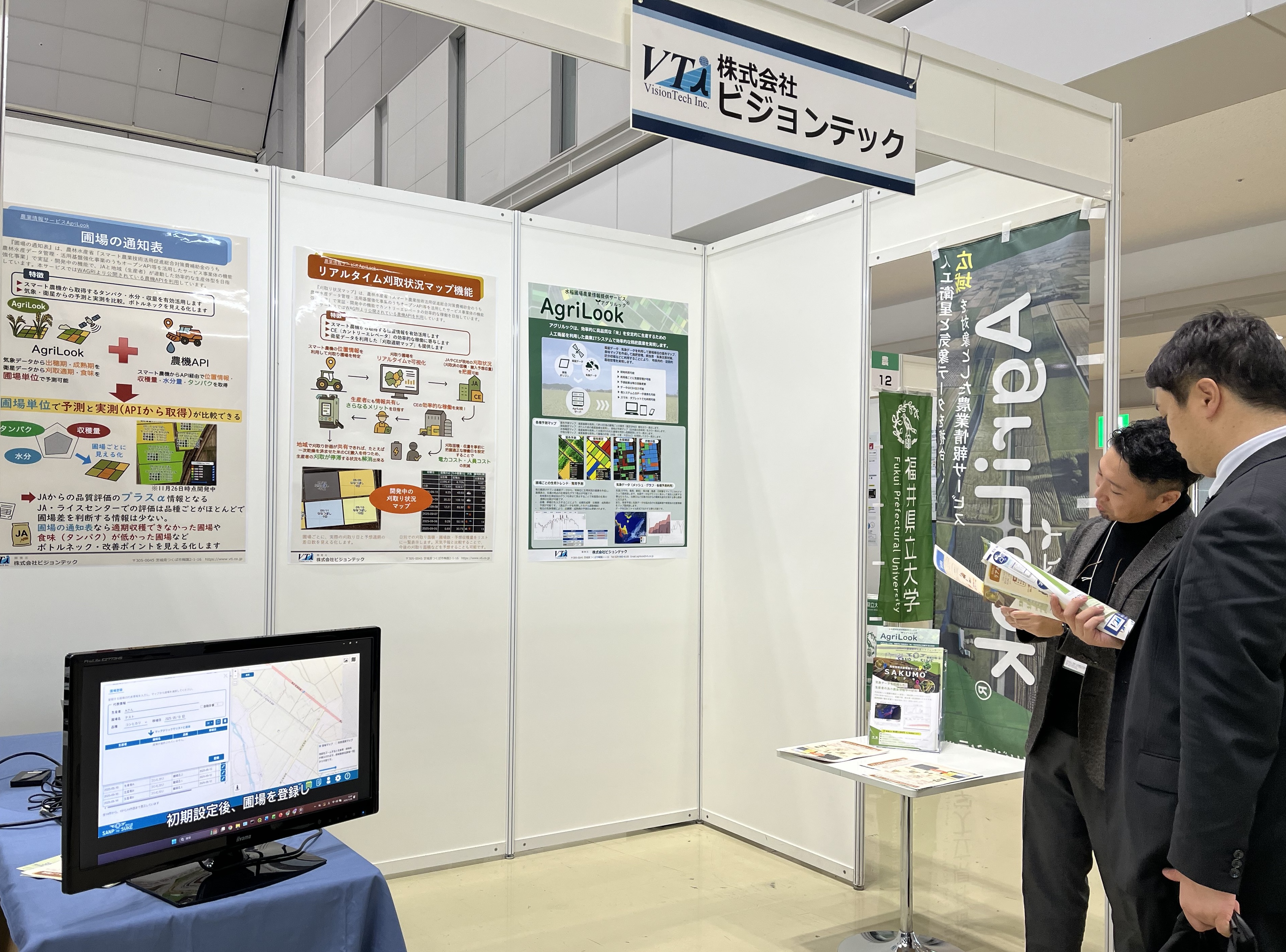 <主催> 農林水産省 <展示内容> 「令和7年度スマート農業技術開発促進総合対策補助金のうち農林水産データ管理・活用基盤強化事業のうちオープンAPI等を活用したサービス事業体の強化事業」で開発中の、カントリーエレベータの効率的な稼働につなげる「リアルタイム刈取状況マップ機能」とスマート農機から取得するタンパク・水分・収量を有効活用した「圃場の通知表」のご紹介。人工衛星と気象データを複合利用した広域農業情報サービス【AgriLook(アグリルック)】を展示します。 - 2025.10.24 「アグリビジネス創出フェア2025」に出展しました。